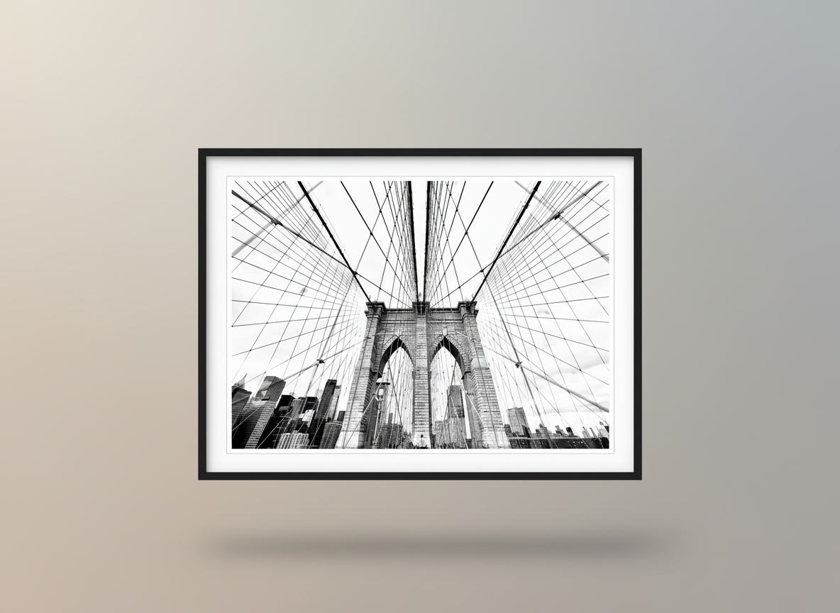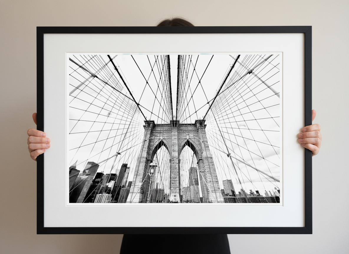 Capturez l'essence iconique de New York avec cette photographie d'architecture saisissante du Pont de Brooklyn. Cette œuvre en noir et blanc révèle la majesté des câbles suspendus et l'élégance intemporelle de ce monument historique, dans une composition qui célèbre la puissance graphique de cette structure légendaire.